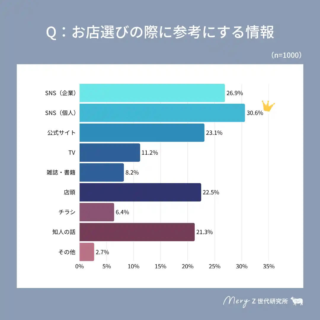 「お店選びの際に参考にする情報源」のアンケートでは、「SNS(個人)」(30.6%)と「SNS(企業)」(26.9%)が上位をを占め、Z世代の多くがお店選びの際にSNSを参考にすることがわかった。 |