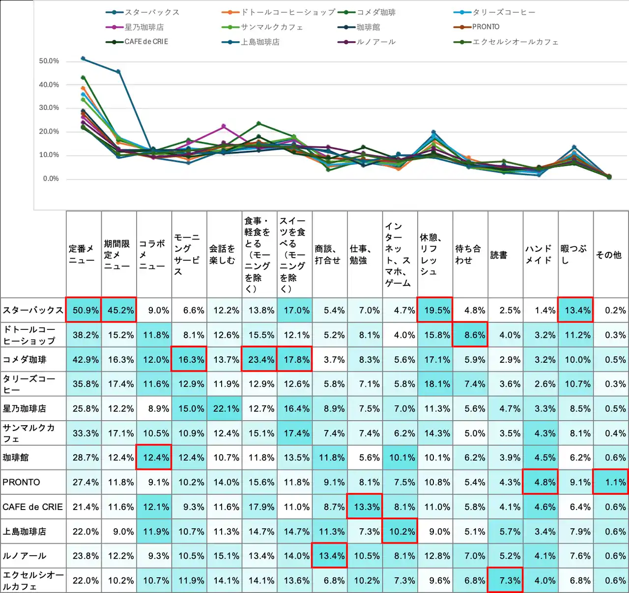 ■期間限定メニューの引きが強く、トレンド感を抑えに行く「スターバックス」と、フードメニューへの支持が多い「コメダ珈琲」 |