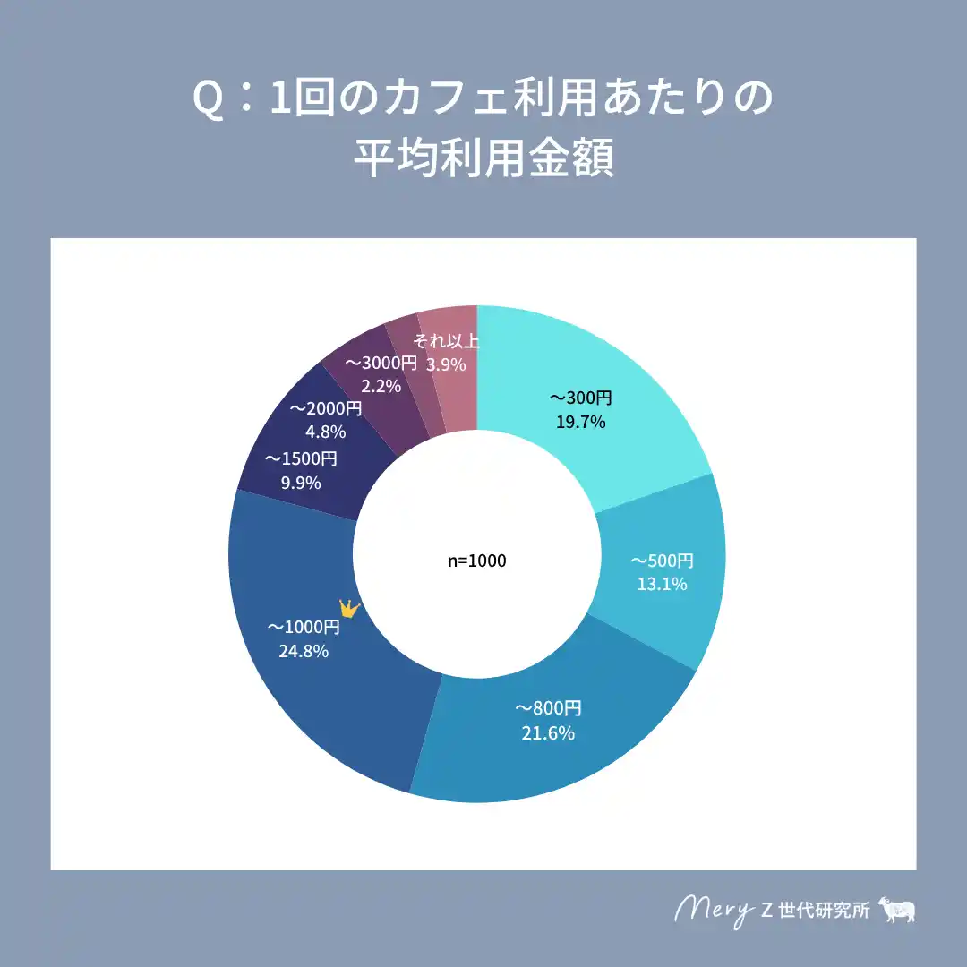 また、「1回のカフェ利用あたりの平均利用金額」についてのアンケートでは、最も多い「800円~1000円」に次いで「500円~800円」が多く、全体の約半数が500円~1000円と回答した。 |