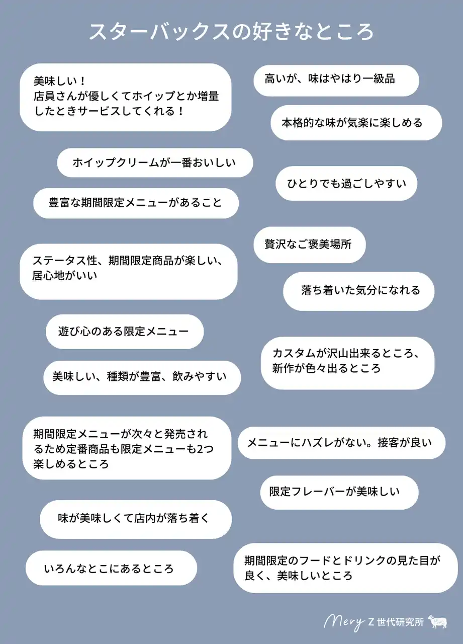 スターバックスを「月に数回」以上利用すると答えた方を対象にした「スターバックスの好きなところ」のコメントでも、定番メニューや期間限定メニューの味や種類についてのコメントが多く見られた。 |