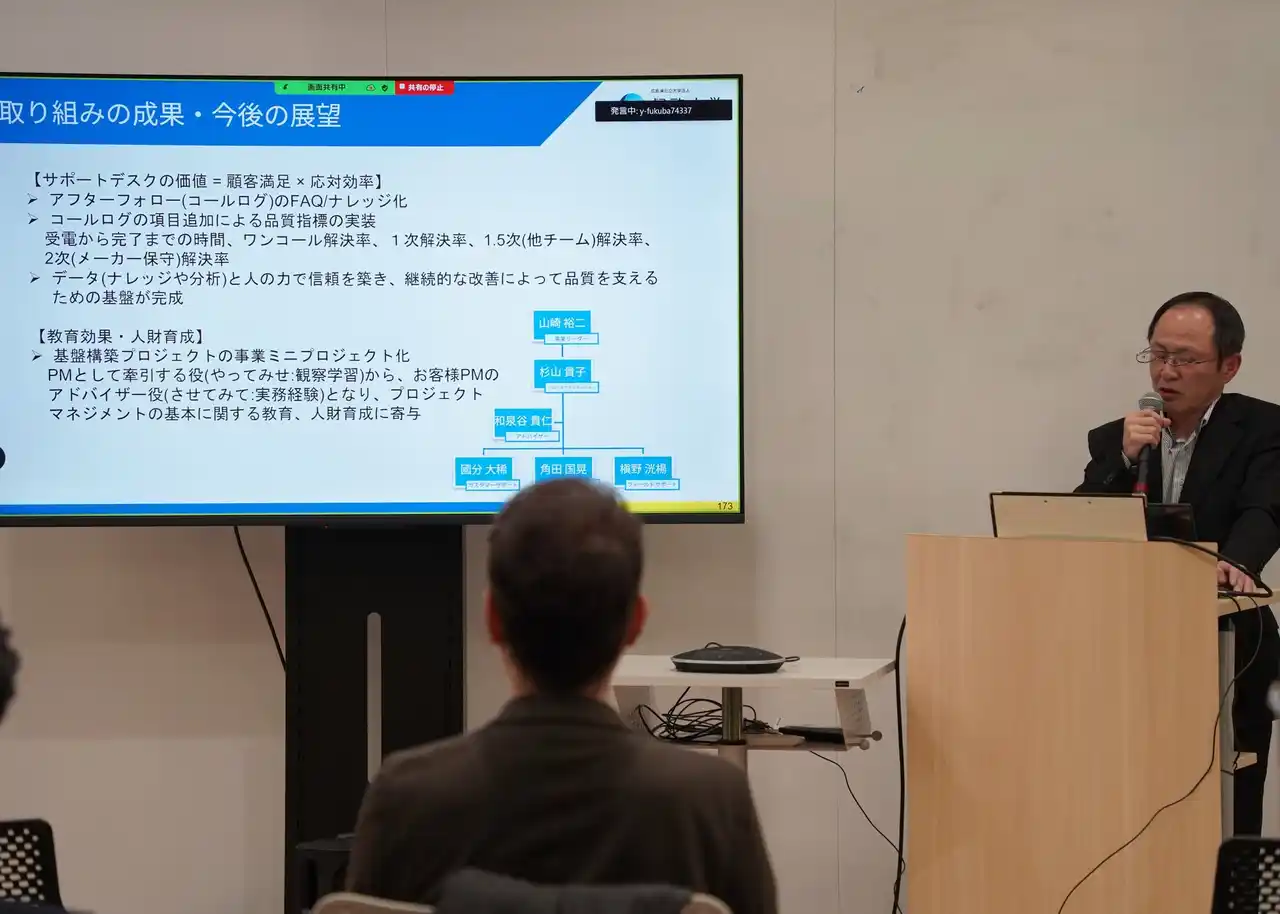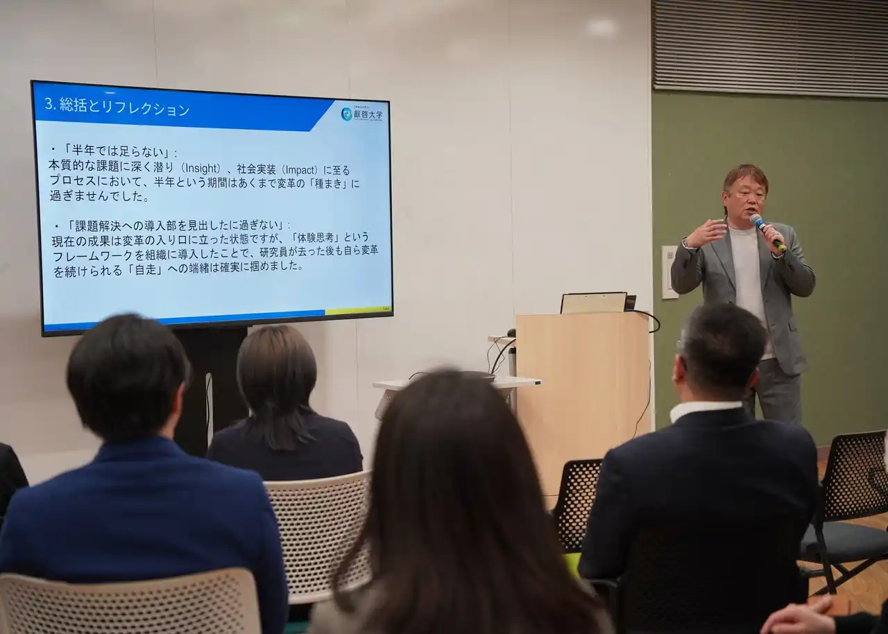 | その後、客員研究員5名によるショート報告が行われ、各企業における半年間の取組成果が紹介され、企業ごとの実課題に対する具体的なアプローチと成果が共有されました。 | |||||||||||
