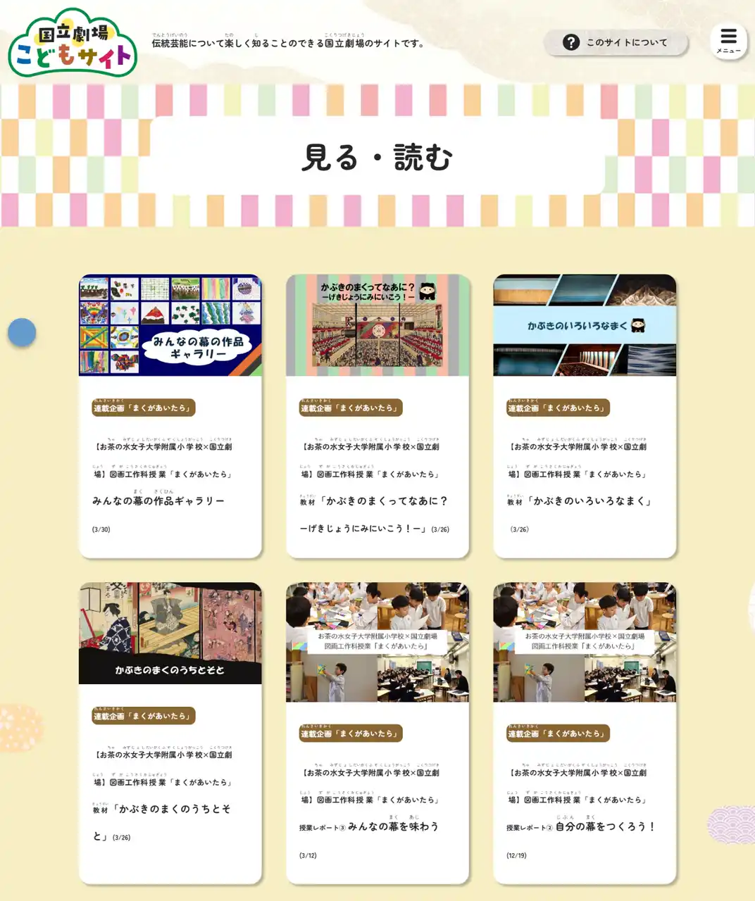 | そしてこの度、研究の一環として、お茶の水女子大学附属小学校にて「歌舞伎の幕」をテーマに図画工作科の授業を共同で行い、その学びのプロセスやこどもたちの創作物、使用した教材等を「まくがあいたら」シリーズとして「国立劇場こどもサイト」に連載いたしました。連載を通して、一つの教育現場を超えて伝統文化の魅力を広く社会に届けることを目指します。ぜひご覧ください。 | |||
