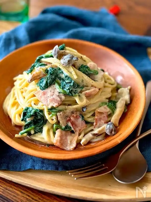醤油が隠し味!ほうれん草とベーコンのクリームパスタ