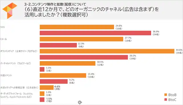 オーガニックチャネルの活用状況では、B2Bで「オウンドメディア(企業サイト・ブログなど)」が44.6%(29名)で首位となり、前年首位の「Eメール」27.7%(18名)を大きく上回りました。B2Cは引き続き「SNS」36.9%(24名)が首位を維持しています。 |