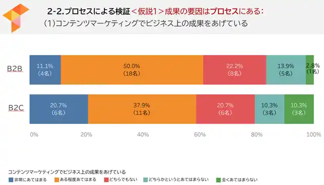 コンテンツマーケティングでビジネス上の成果をあげていると回答した層(「非常に」+「ある程度」あてはまる)は、B2B 61.1%(22名)、B2C 58.6%(17名)と、いずれも約6割が成果を実感しています。2024年のB2B 約65%からは微減ですが、2023年からの推移を見ると高水準での安定が続いており、コンテンツマーケティングが「お試し」ではなく「定着・成熟フェーズ」であることを示していると考えられます。 |