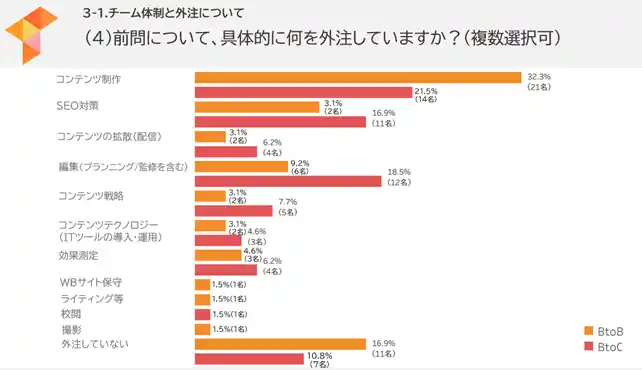 外注内容ではB2B・B2C共に「コンテンツ制作」が最多ですが、B2Cでは「編集」「SEO対策」が僅差で続き、複数の領域に外注が分散している傾向が見られます。B2Bでは専門性の高い特定業務への絞り込みが進む一方、B2Cでは制作から配信・最適化まで幅広く外部リソースを活用するスタイルが定着しつつあります。 |