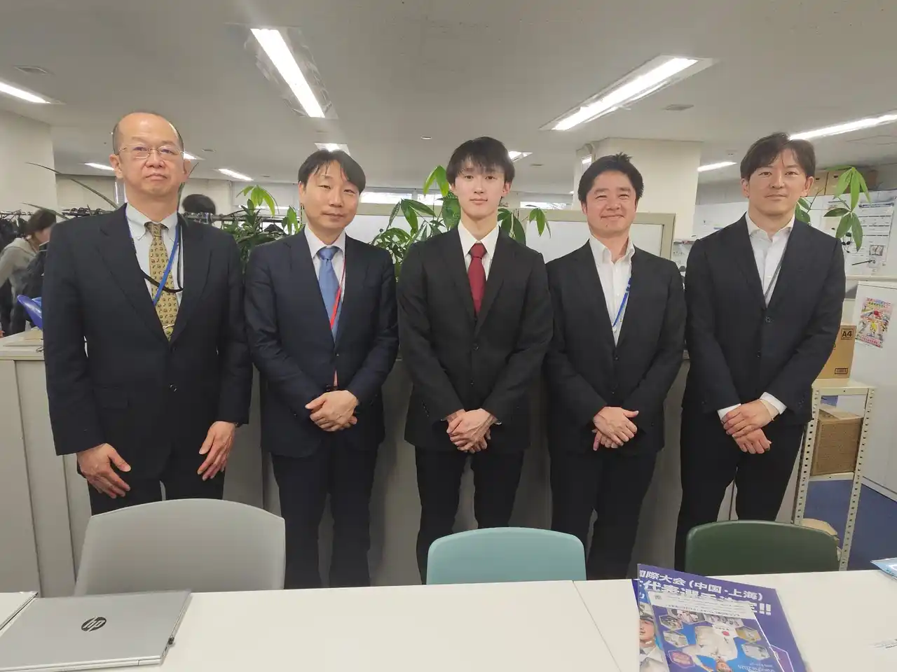 国土交通省 水管理・国土保全局にて 左から)水道事業課 課長 筒井誠二様、「水技術」職種エキスパート 水谷圭亮(水ingAM)、日本代表選手 三澤希美也(水ingAM)、上下水道企画課 上下水道事業調整官 若公崇敏様、水道事業課 課長補佐 福田竜平様 |