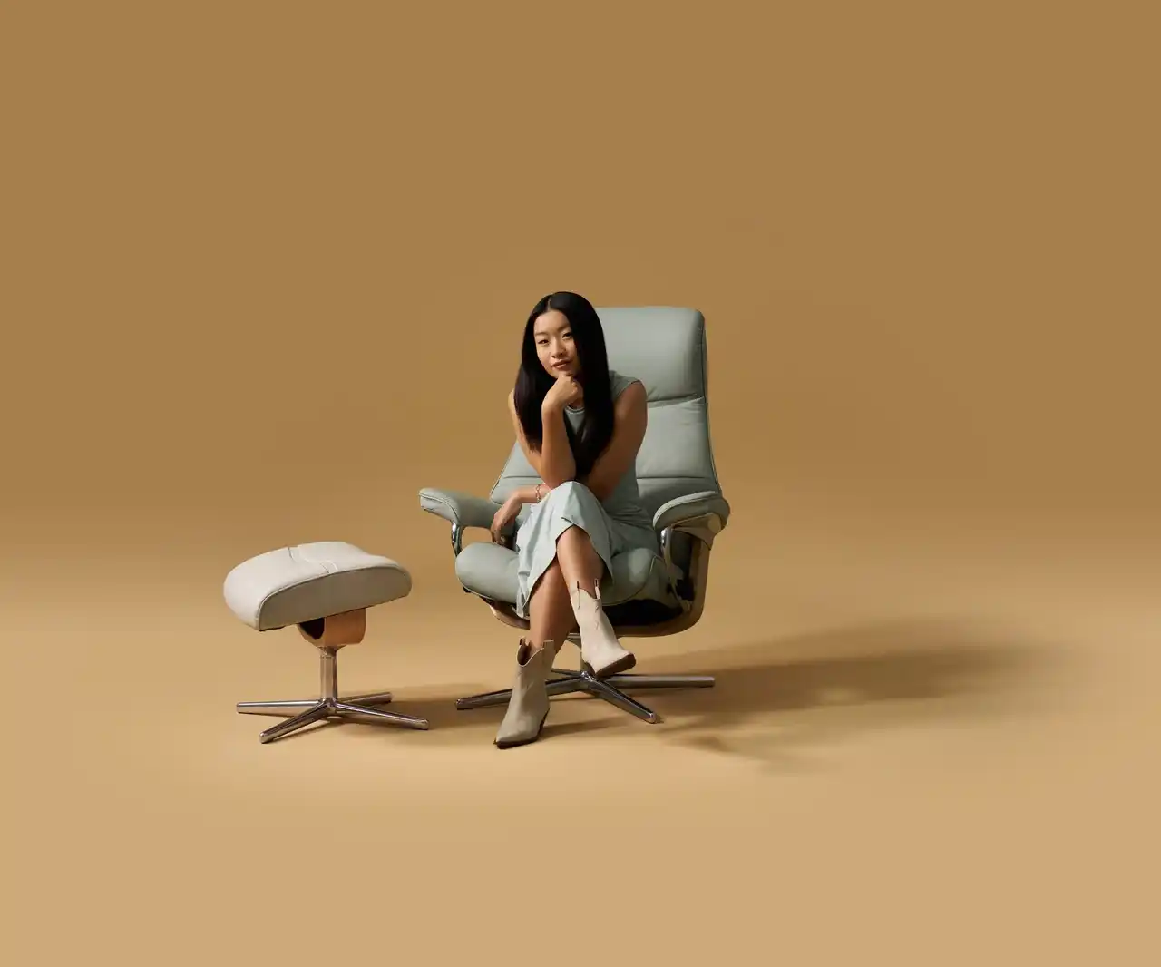 主流のオットマン付きリクライニングチェアはクッションのデザイン、張地、ベースをカスタマイズできるのも魅力 |