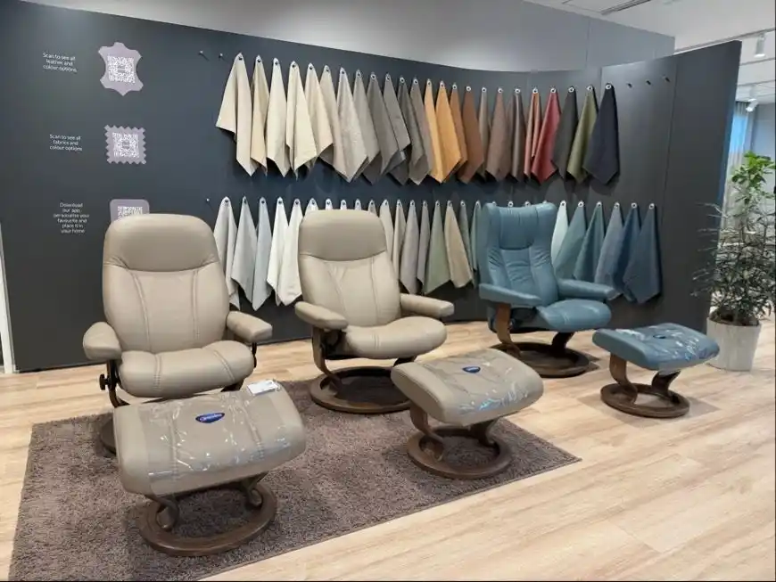 人気のストレスレス(R)チェアもS,Mサイズがそろう。豊富な張地でレザーやファブリックを手に取って選べる |