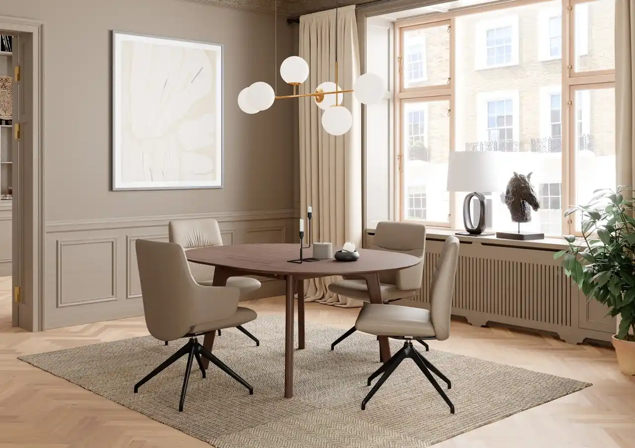 チェア:座り心地が良く360度回転式のミントD350 テーブル:伸長式でサイズを広げられるボルドー |