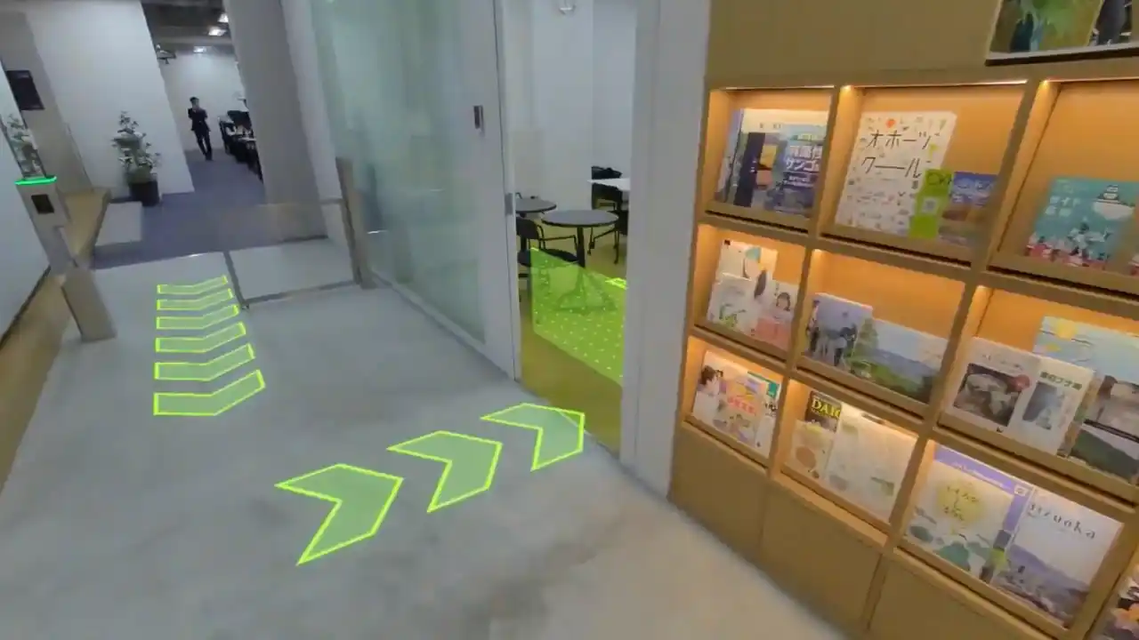 まず、〈現実情報と従来では可視化できなかった情報を融合・相互補完する〉ことで直感的な理解を促します。視聴デバイスを通して、約20分間かけてオフィス内10スポットから「空間・建物全体の鳥瞰や構造内部」「設計思想や使用素材の持つ背景」「パーパスを反映したワークシーンの体現過程や組織の価値観」などを可視化します。 |
