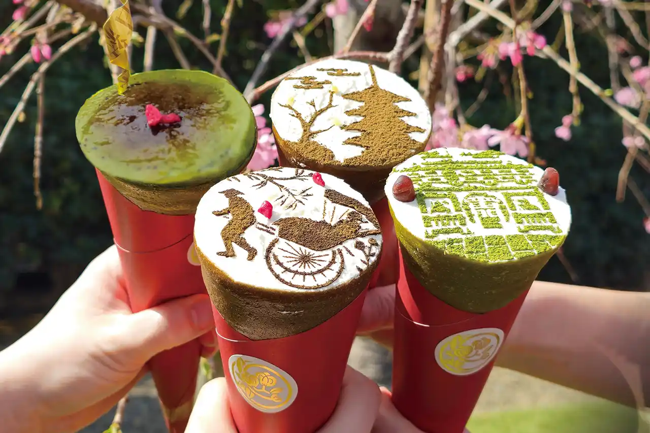 甘紋の香の和クレープは、天面に家紋や枯山水などの和モチーフがほうじ茶パウダーや抹茶パウダーで描かれており、抹茶と合わせて提供する茶菓子としても視覚・味覚の両面で高い満足度を提供できます。 |