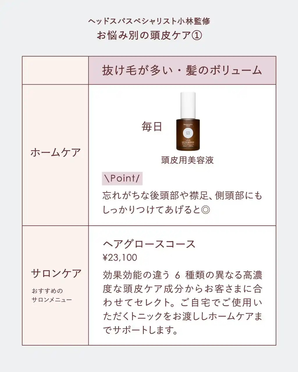 効果効能の違う6種類の異なる高濃度な頭皮ケア成分からお客さまに合わせてセレクト。ご自宅でご使用いただくトニックをお渡ししホームケアまでサポート |