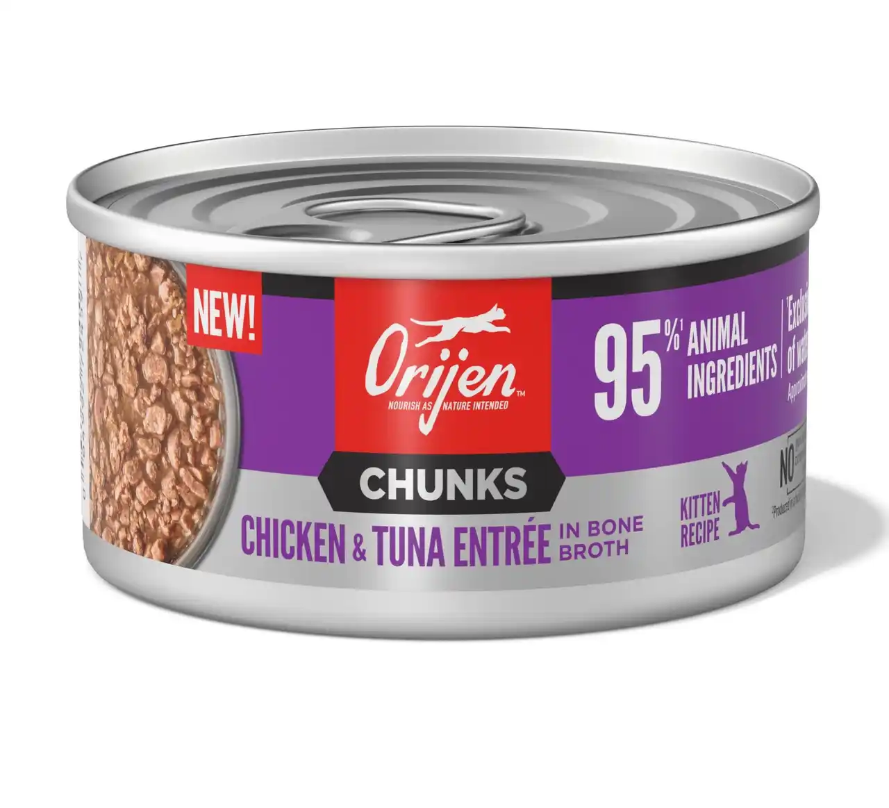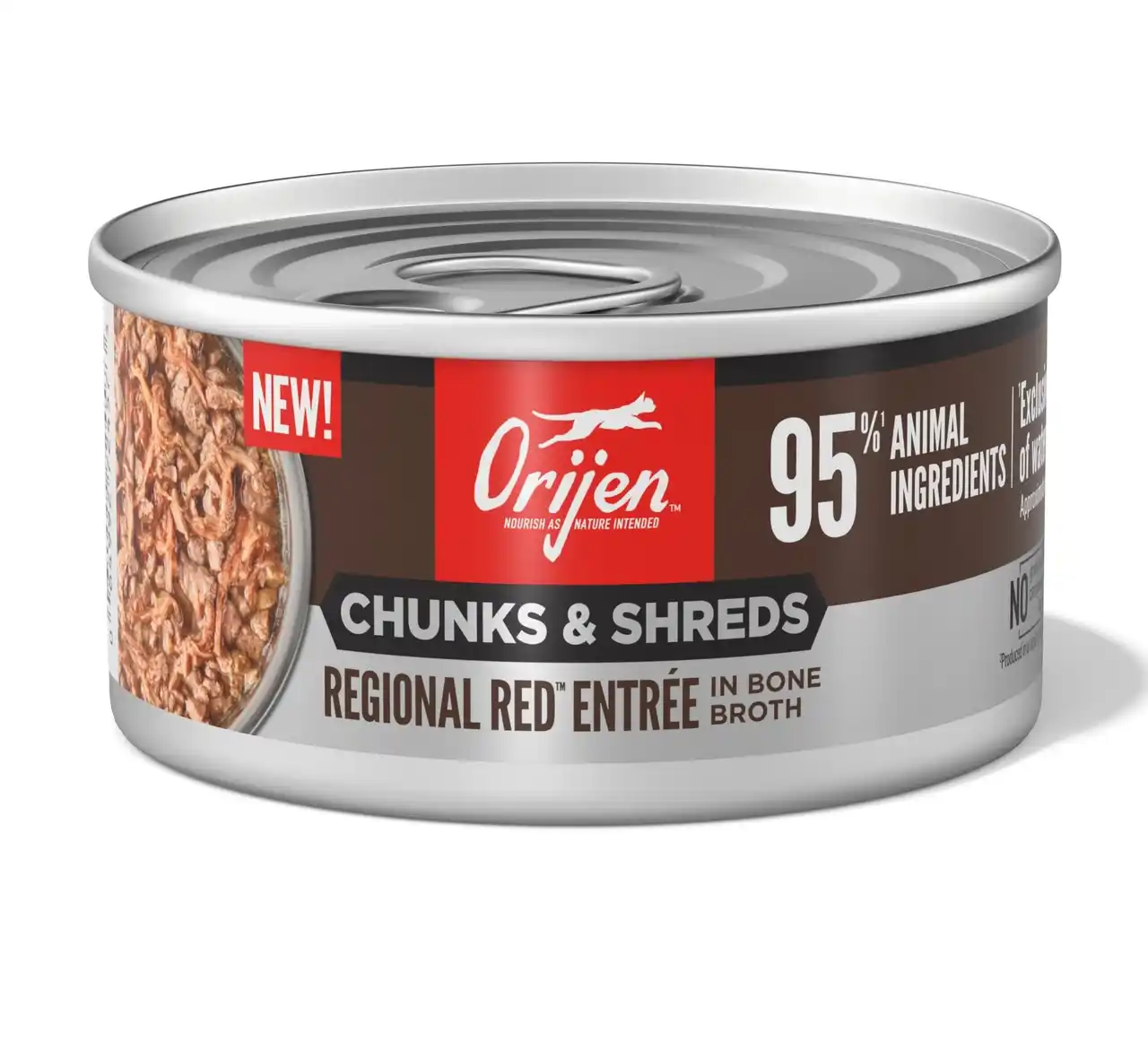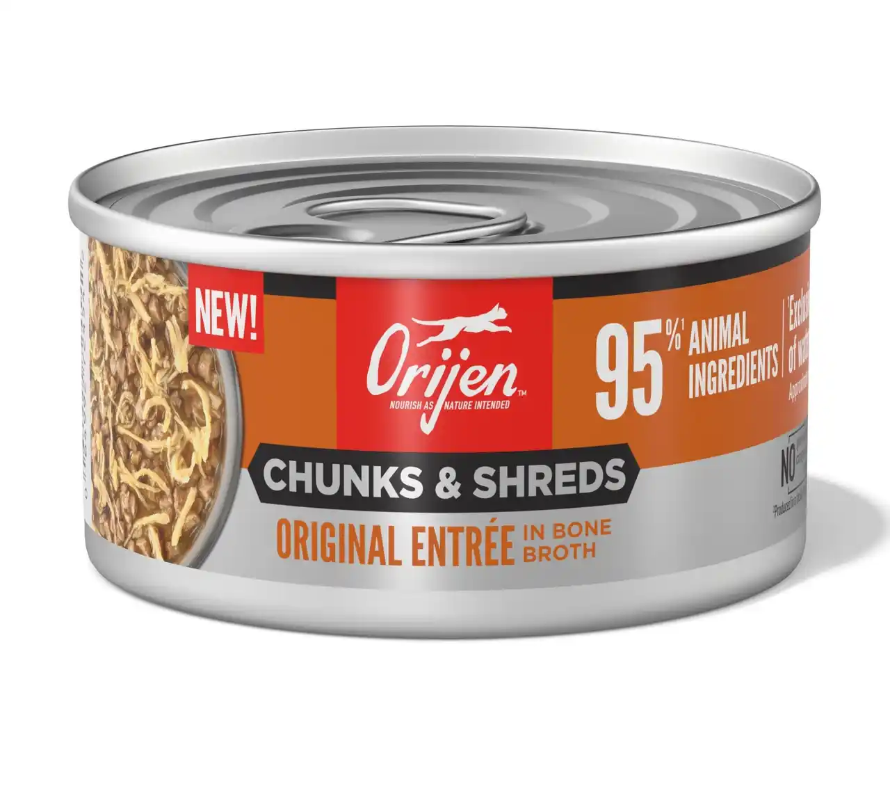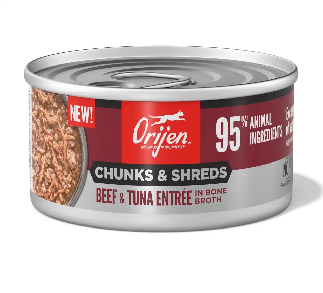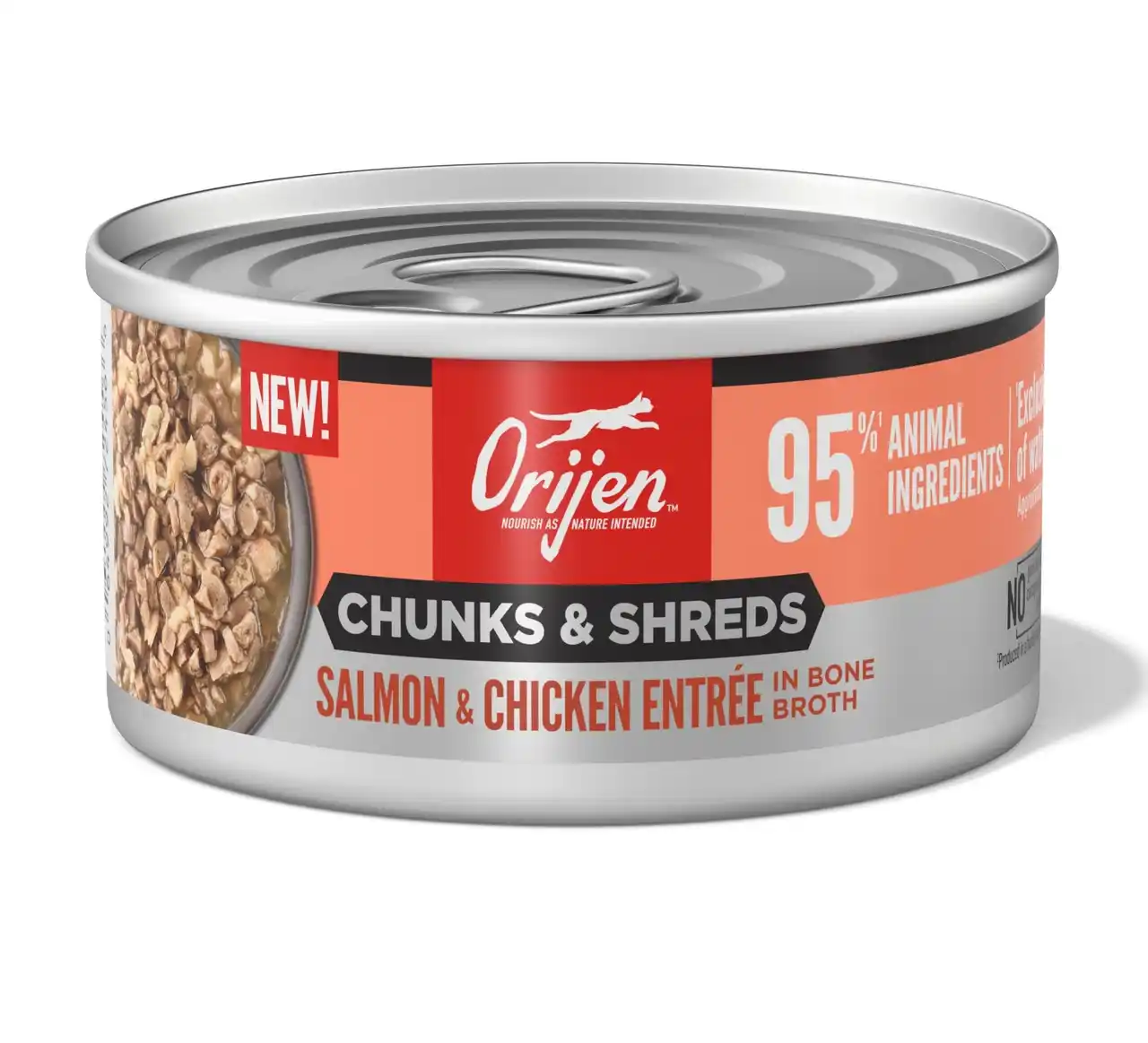 | ORIJENチャンク&シュレッドは、猫本来の肉食性に着目し、動物性原材料を約95%配合したウェットフードです。肉の塊(チャンク)と細切り肉(シュレッド)を組み合わせることで、豊かな香りと食べ応えを実現しました。 | ||||||||||||||