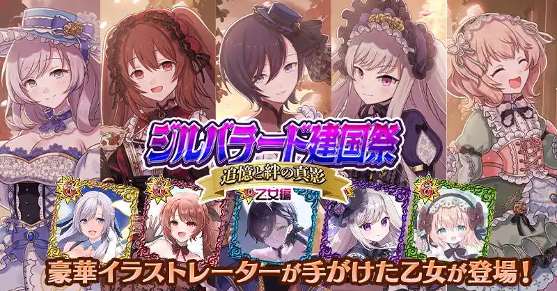 11周年記念イベント第一弾として、「ラナン」「カトレア」「スフレ」「プルメリア」「ロザリー」の5乙女をメインとしたイベント『ジルバラード建国祭 追憶と絆の真影 乙女編』を開催中です。 |