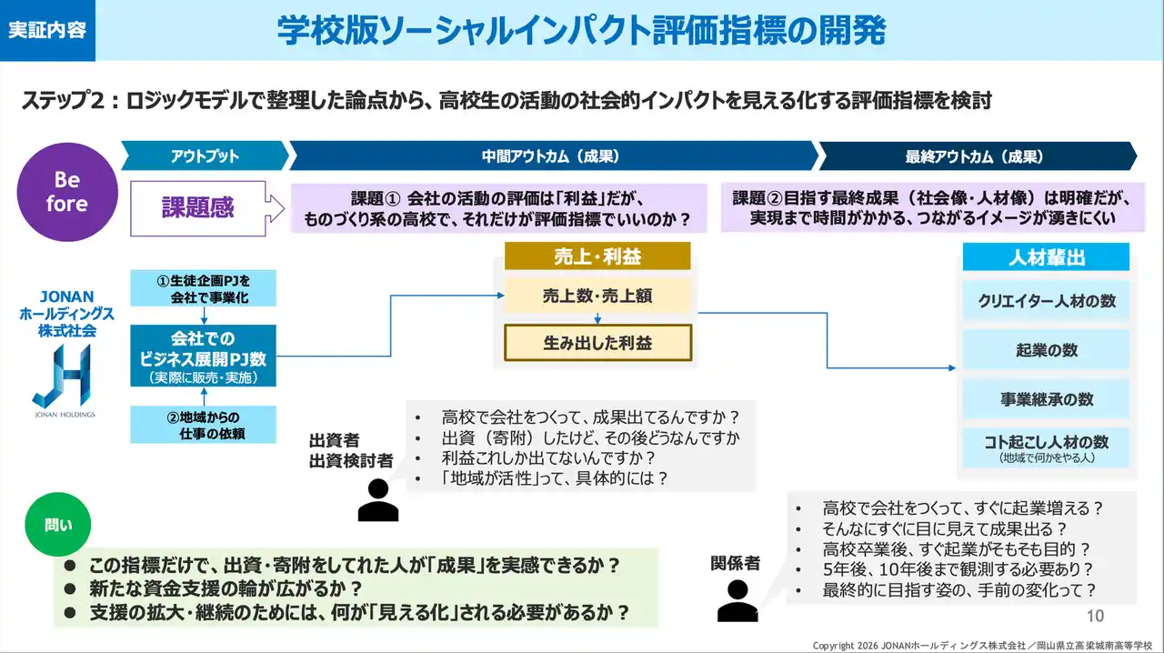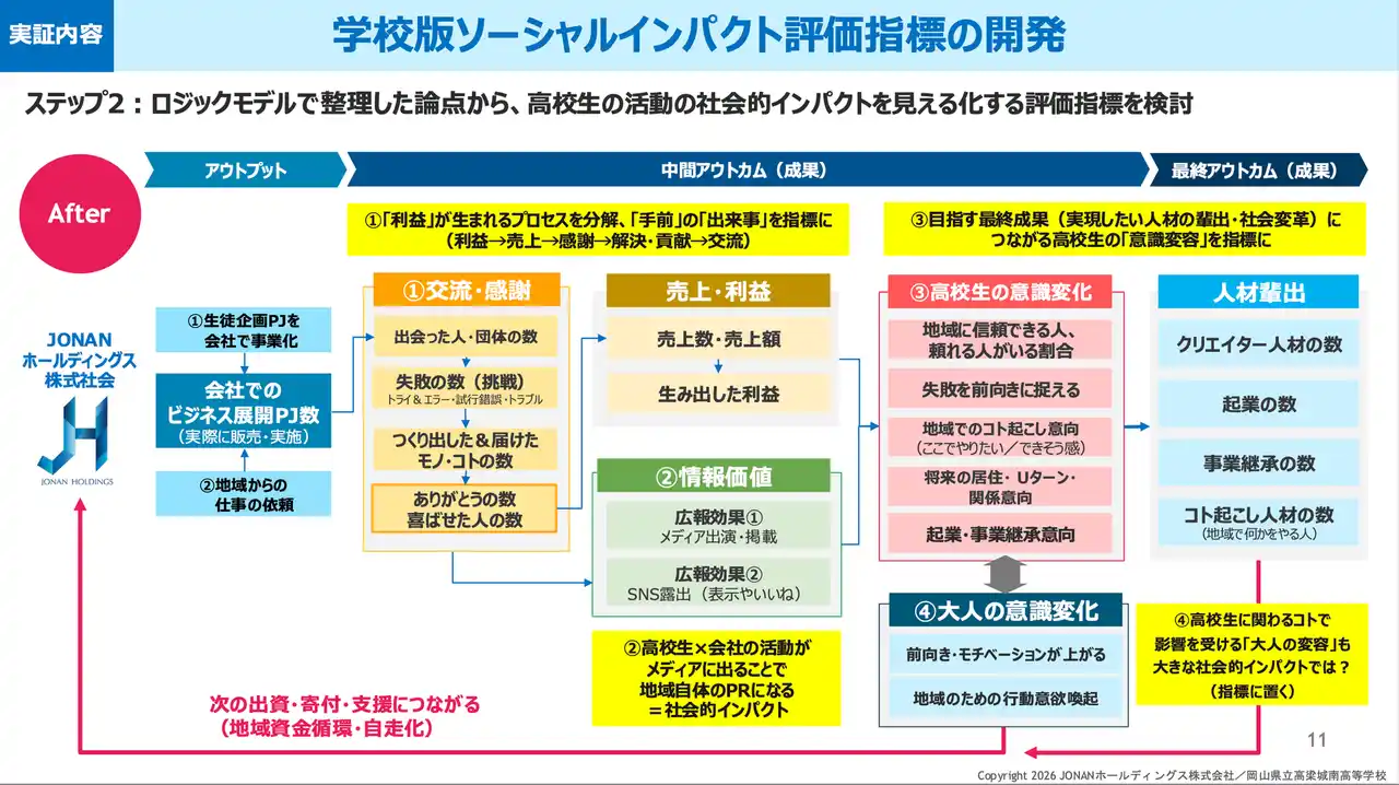 JONANホールディングス株式会社(岡山県高梁市)は、岡山県立高梁城南高等学校および高梁まなびとしごと未来共創コンソーシアムと連携し、全国初となる「学校版ソーシャルインパクト評価」を開発・実装しました。 |