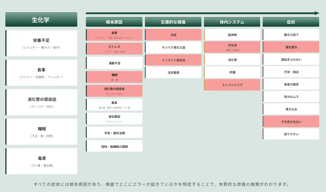 | エグゼクティブヘルスコーチは、分子栄養学や機能性医学(ファンクショナルヘルス)の知見をベースに、個々の体調データや生活習慣、検査結果を統合的に分析し、「症状 → 体内システム → 生理的損傷 → 根本原因」という構造で整理された根本原因マップを用いて、現在抱えている不調やパフォーマンス低下のメカニズムを明確化します。 | |||||||