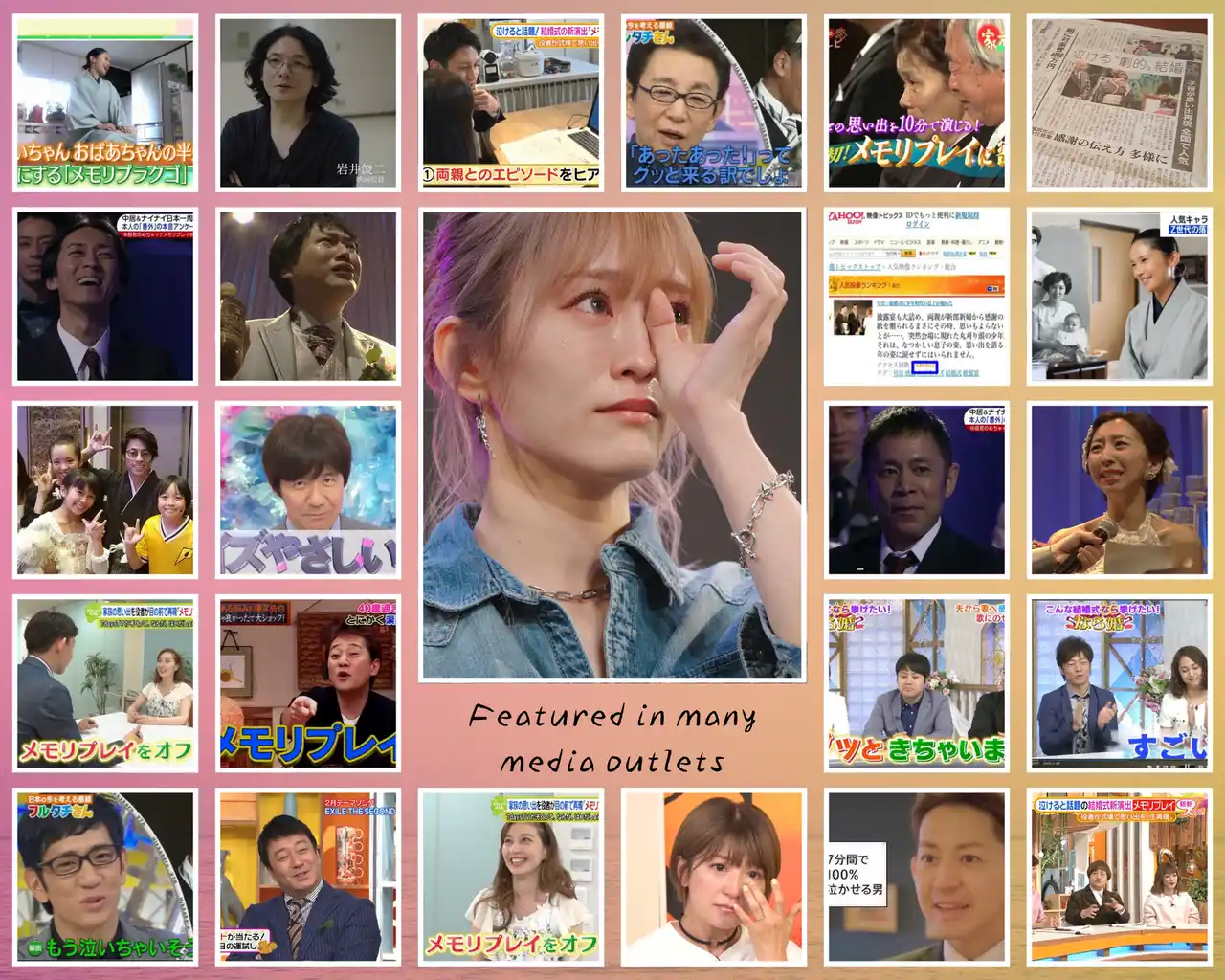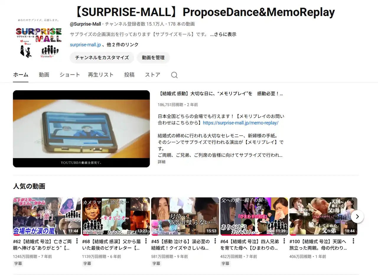 「メモリプレイ」は、新郎新婦や家族の人生を、役者が子ども時代から再現して演じる“記憶の演劇”です。 結婚式の披露宴で突如始まるこの演出は、「涙なしでは見られない」とSNSでも話題となり、これまでにテレビやラジオ、新聞、映画、CM、WEBメディアなど多数のメディアでも取り上げられました。 YouTubeでは1億回近い総再生回数を記録し、“一生に一度の感動”を届ける演出として、全国で高い評価を得ています。 |
