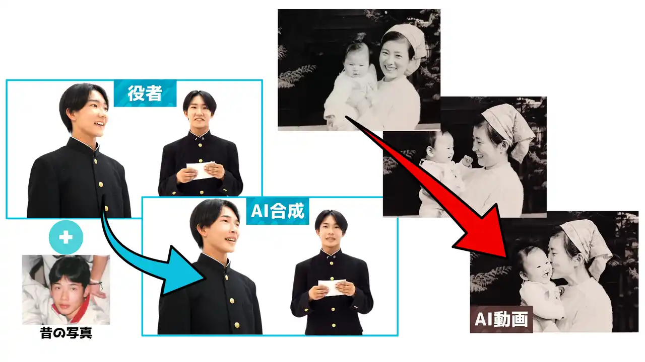 ・過去の写真をもとに、思い出を映像として再現 ・フェイスチェンジ技術により、過去と現在の自分を一つの作品の中で融合 |