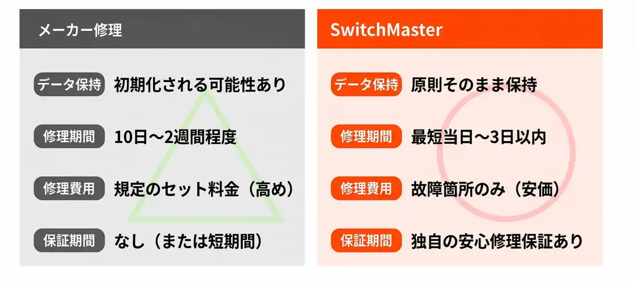 SwitchMasterは、「メーカー修理ではデータが消えると言われた」「買い替えるには高すぎる」「修理に数週間も待てない」といったユーザーの切実な悩みを解決。 |