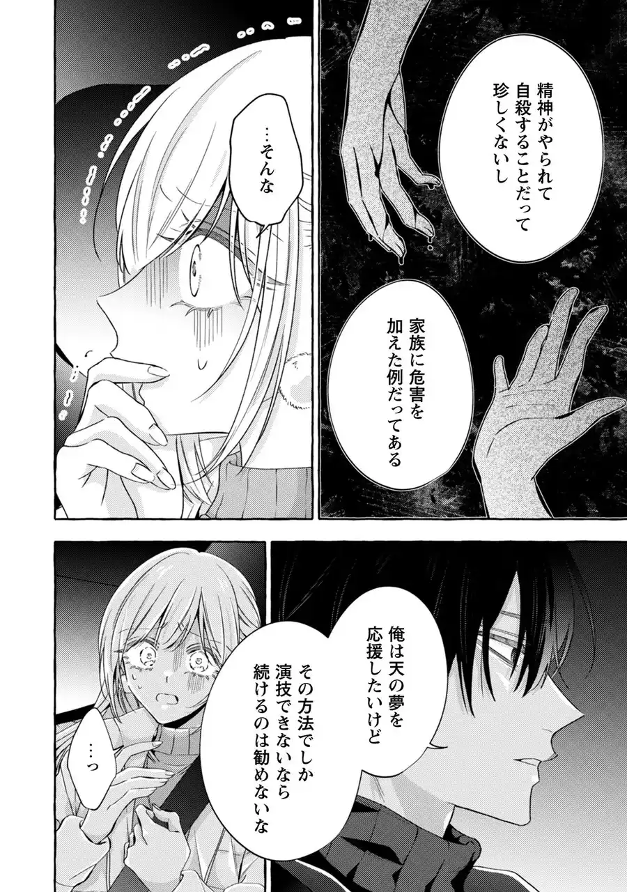 | 一方、役者としての道に目覚めた天は、気鋭の監督・田沼(田中幸太朗)の新作オーディションに臨み、俳優としての道を着実に歩んでいく。だがそれは、千秋の不安と嫉妬心を駆り立てることになり、その愛情は徐々に独占欲と執着に変わっていく…。 | |||