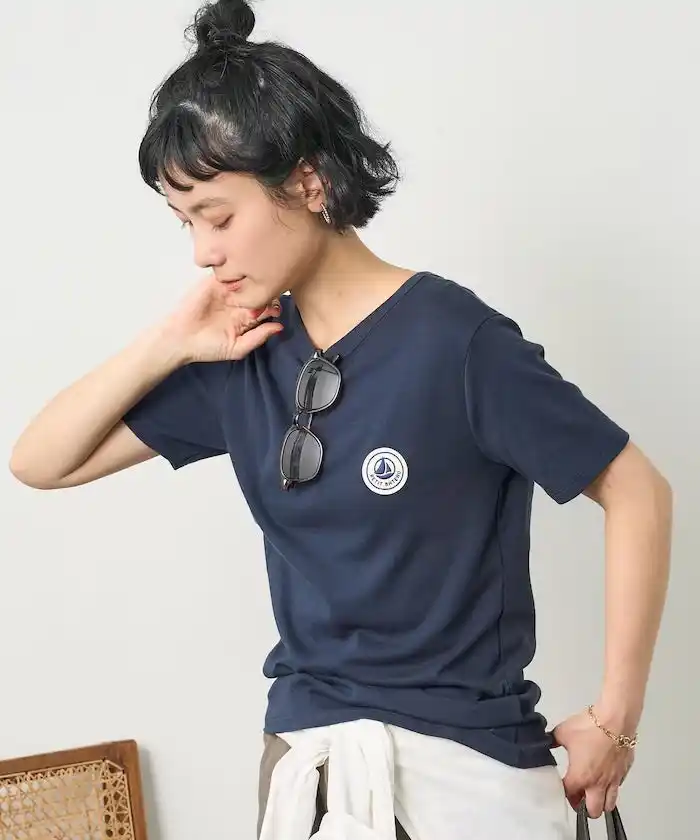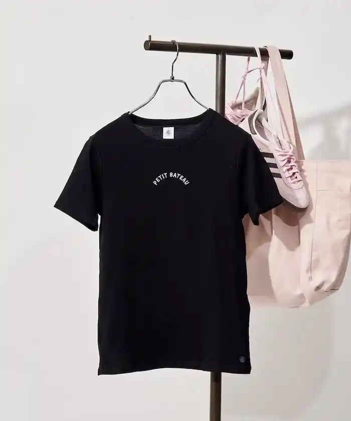 アイコニックなPETIT BATEAUのロゴマークをワッペンであしらったTシャツ ベーシックなシルエットで着回しやすく、カジュアルながらも大人っぽい印象に仕上がる一枚 |