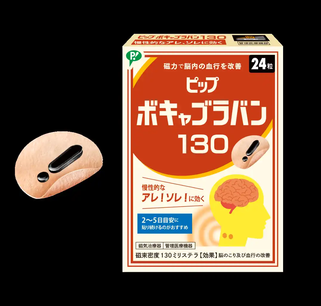 ピンポイントでコリを解消する「ピップエレキバン」。磁気が体内成分に働きかけ血行を良くし、コリの原因となる老廃物を流します。貼っている間中効果が続くので、2~5日間貼ることを推奨します。そのままお風呂にも入れます。磁力の強さを選べるため、コリの状態によって使い分けが可能。こっているな、と思うところを指で軽く押さえ「少し痛い、気持ちいい」と感じるところに貼ったり、必要に応じてその周囲にご使用ください。 |