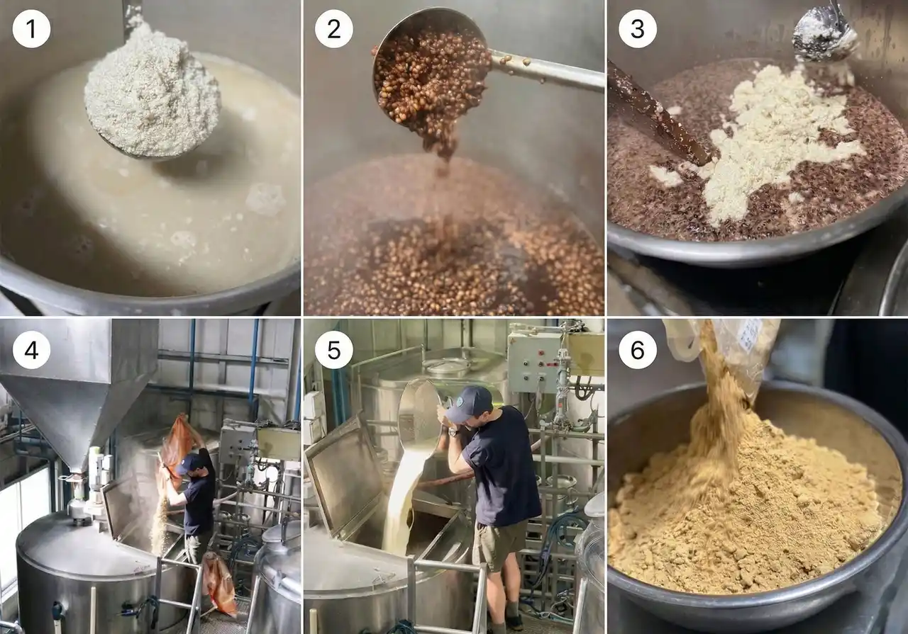 | こうしてやわらかくした雑穀を、麦芽とお湯を合わせた“マッシュ”に加え、ビールのもとになる麦汁を作成。さらに、きな粉は香ばしい風味を活かすため、麦汁の煮沸工程の後半で投入し、その後発酵させて完成します。 | |||||||||||||||||||
