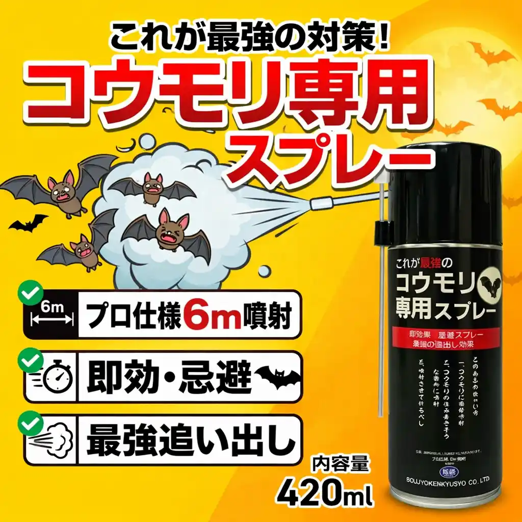 特徴・・・・・屋根裏や戸袋などに住みついたコウモリを天然植物成分の強力なハッカ臭で追い出すコウモリ専用スプレーです。 |