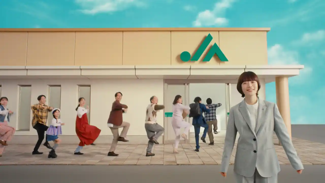 | 心弾むメロディに乗せて、街の人々が楽しげなステップで行進し、JAバンクへと向かいます。窓口では、JA職員「ハナちゃん」役の杉咲花さんが、新社会人やサラリーマン、年金受給者など、訪れる多世代の方々の相談に笑顔で応じます。 | |||||||||||||||||||