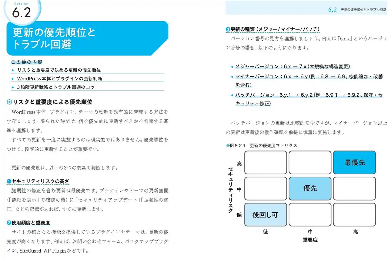 「制作や運営はできるけれど、セキュリティはよく分からない」といった不安を抱える方に向けて、導入時の基本対策、ログインやユーザー管理、プラグインやテーマの運用といった、実務で必ず直面する場面ごとに、画面写真や図解を使って具体的に解説しています。 |