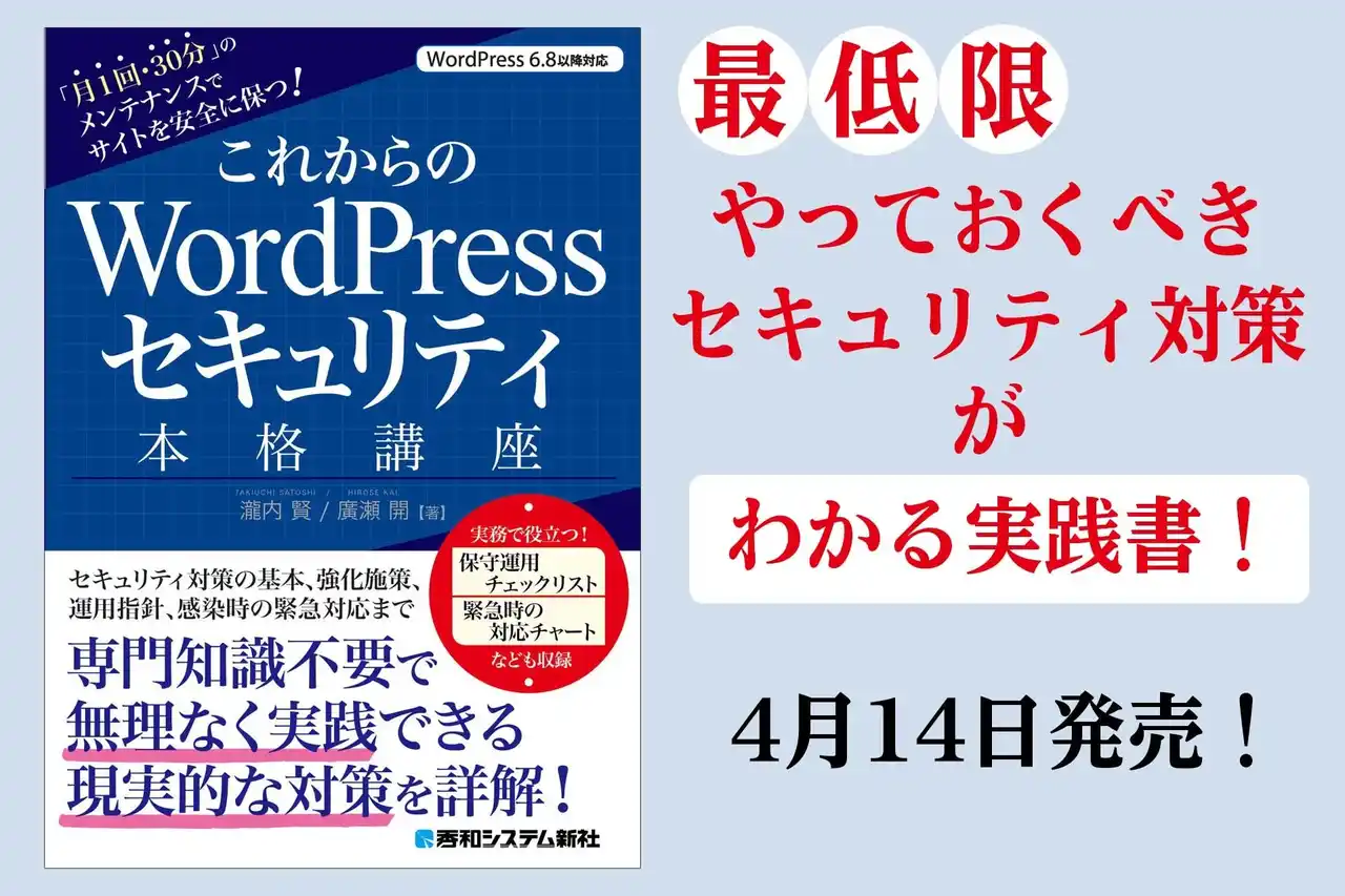 株式会社秀和システム新社(東京都千代田区・代表取締役 津島憲豪)は、2026年4月14日(火)、新刊『これからのWordPressセキュリティ本格講座』を発刊します。 |