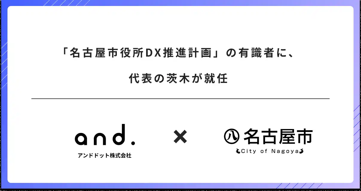 AXプロデュース事業を展開するアンドドット株式会社(本社:東京都渋谷区、代表取締役:茨木 雄太、以下:アンドドット)の代表の茨木は名古屋市が設置する「名古屋市役所DX推進計画有識者懇談会」の委員に就任しました。 |