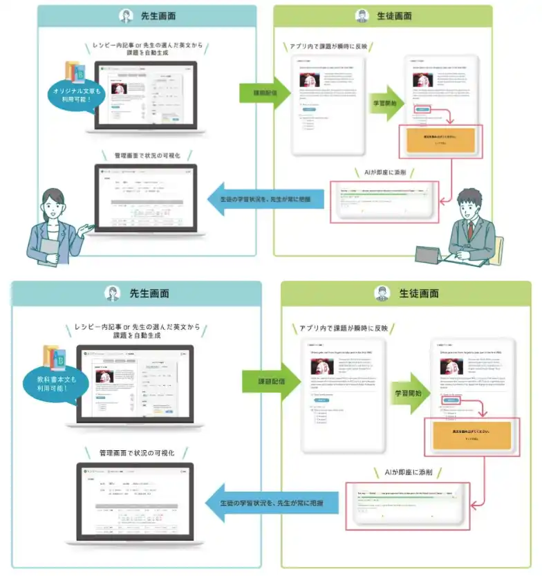 | 英語学習アプリ『レシピー』の機能を教育機関向けに提供しているのが『レシピー for School』です。教育現場における生徒・教員の課題にアプローチし、教員の業務負担を軽減しながら、個別最適化された学習の実現を支援するAI活用の新しい形を提案しています。 | |||