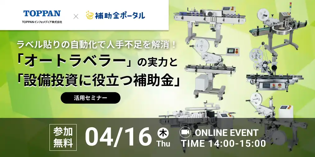 株式会社補助金ポータル(本社:東京都渋谷区、代表取締役:福井彰次)は、TOPPANインフォメディアと共催で、「ラベル貼りの自動化で人手不足を解消!「オートラベラー」の実力と「設備投資に役立つ補助金」活用セミナー」無料オンラインセミナーを、4月16日(木)14:00より開催いたします。エネルギー価格の高騰や深刻な人手不足への対応、生産現場のDX推進など、製造・物流業界が抱える課題解決に向けた自動化ソリューションと、その導入を後押しする補助金の活用法を解説します。 |