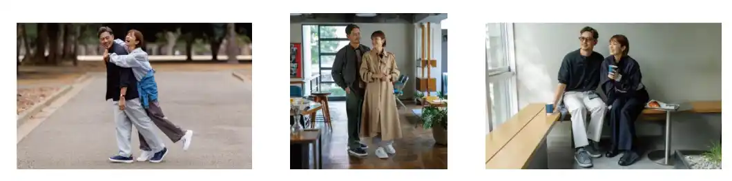 畑野ひろ子さん・鈴木啓太さん夫婦をモデルに撮影したビジュアルでは、子育てがひと段落した夫婦の休日をテーマに、二人で街を散歩する自然体のシーンを表現しています。新しいスニーカーを履いて並んで歩くことで、何気ない街の風景や会話がより豊かな時間へと変わっていく、そんな大人のライフスタイルを描いています。まさに「これからの二人の時間を心地よく広げてくれる一足」です。 |