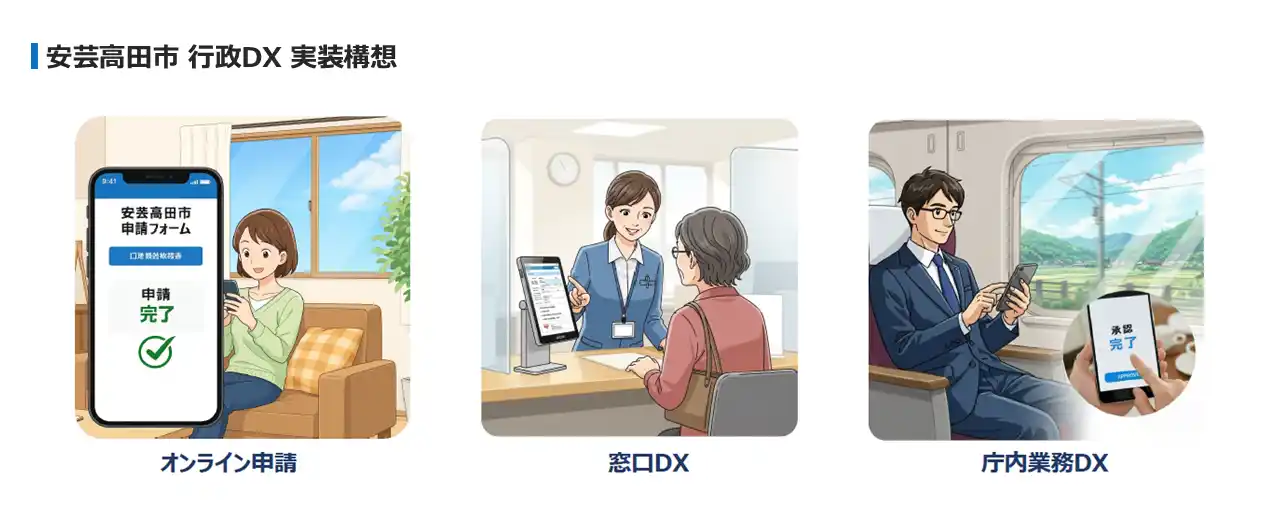 本取り組みでは、広島県安芸高田市において「誰もがデジタルの利便性を享受できるまち」の実現に向け、当社サービス「eformsign(イーフォームサイン)」を活用した庁内外手続きの行政DX実証事業を実施します。 |