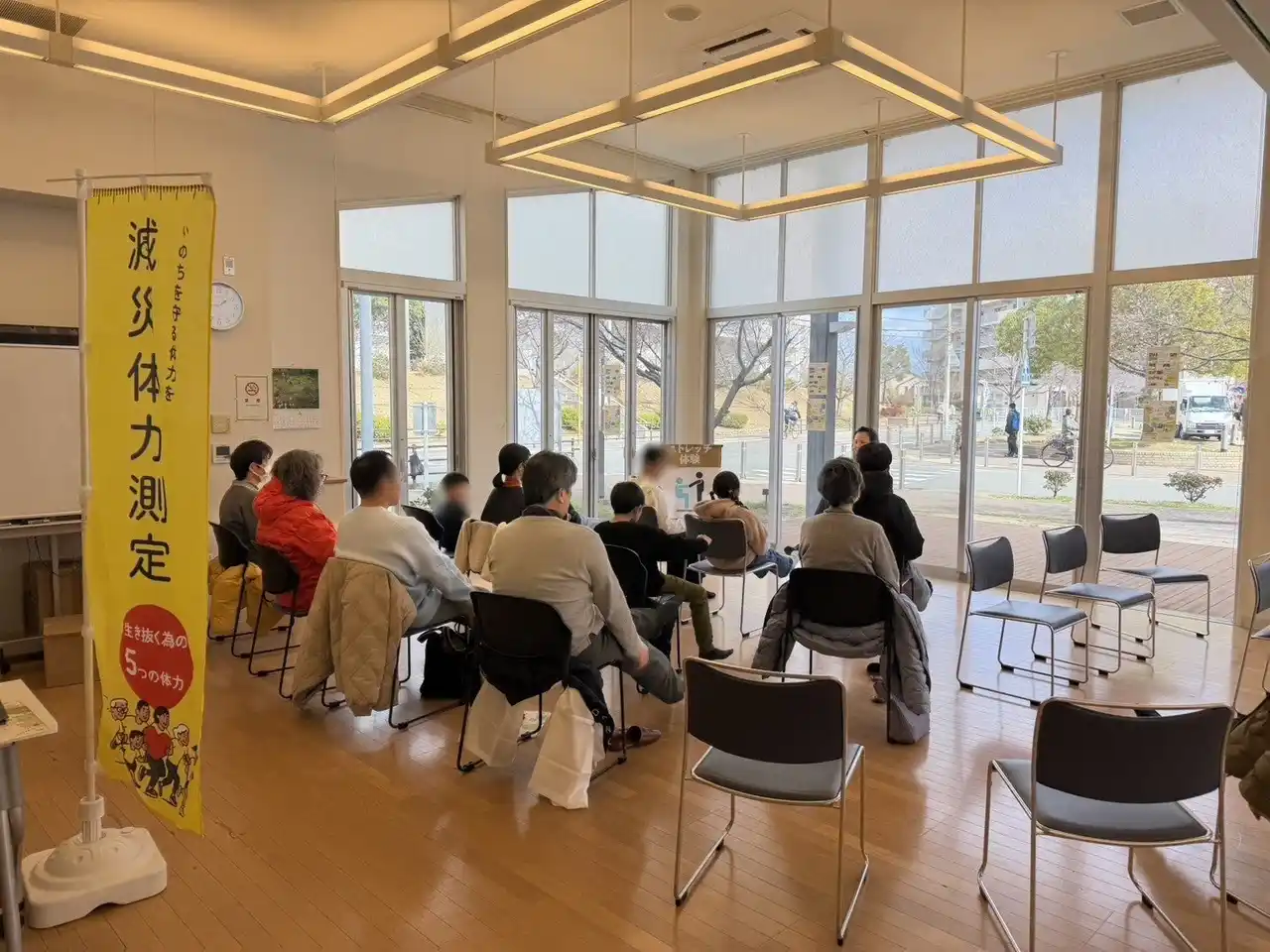 減災体力測定は「簡易測定」と「正式測定」の2タイプから選択可能です。今回の池田市イベントは集団で参加しやすい簡易測定で実施しました。 |