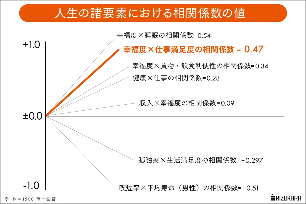 またミズカラが2025年の8月~10月に実施した「幸福度と仕事満足度の相関係数」調査によれば、仕事満足度と幸福度の相関係数は0.47と「非常に高い関連性を持つ」ことが判明しました。相関係数とは、2つの要素の関係性を表す指数で「片方が上がった時にもう一方が連動して上がる度合い」を数値化したものです。 |