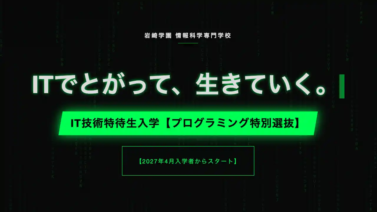 学校法人岩崎学園(横浜市神奈川区)は、情報科学専門学校の2027年4月入学者を対象として、「IT技術特待生入学【プログラミング特別 選抜】」を新設いたします。従来のバランス型の特待生制度では評価しきれなかった、突出したIT技術を持つ「とがった人材」を対象とする、新しい特待生制度です。 |