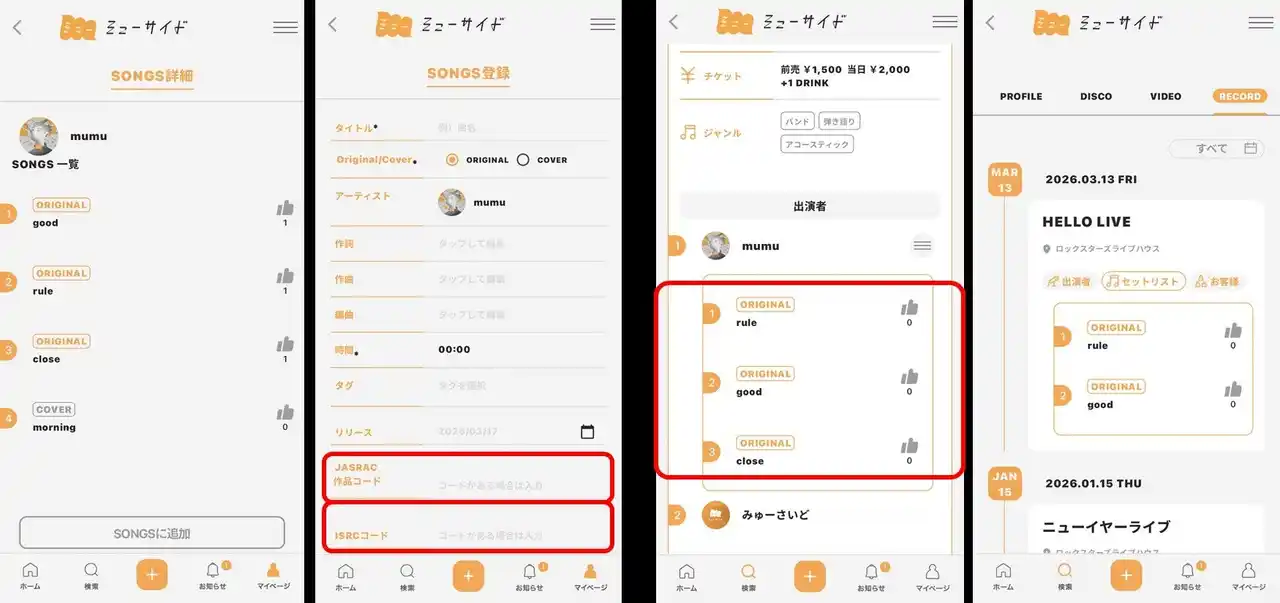 ※過去のライブイベントで演奏した共演者やセットリストを記録できる機能。 |