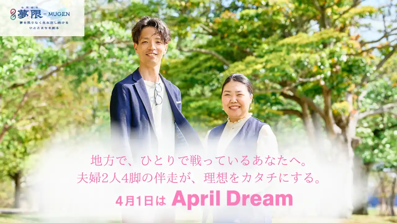 合同会社夢限-MUGEN(本社:長崎県長崎市 代表:林幸之・林成美)は、今年もApril Dreamに賛同し、夢を発信します。私たちの夢は、地方で奮闘する全国のひとり経営者が、手触り感のある伴走によって「今すぐ動ける」「自分が本当に心から理想とするワークスタイルを作れている」と感じられる世界をつくることです。 |