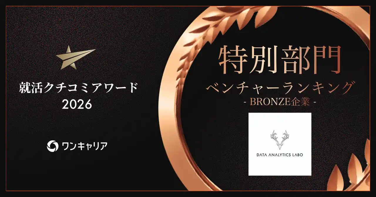 データアナリティクスラボ株式会社(本社:東京都、代表取締役:近藤雅彦)は、株式会社ワンキャリアが発表した「ワンキャリア 就活クチコミアワード2026」において、ベンチャーランキングに選出されたことをお 知らせいたします。 『ワンキャリア 就活クチコミアワード2026』特設サイト 今回の選出においては、当社が提供する「未経験から実務レベルへ到達する育成環境」と、「企 業と学生が相互理解を深める選考プロセス」が評価されたと考えております。 当社の新卒採用では、候補者一人ひとりの志向性や価値観と向き合うプロセスを重視していま す。選考を通じて自己理解を深められる設計や、実務に近い課題に取り組む機会を提供すること で、「入社後の成長イメージが持てる」といった声を多くいただいています。また、入社後の育成 においては、データ分析の基礎から機械学習モデル開発までを一貫して学べる独自の研修プロ グラムを提供しています。これにより、未経験からでも段階的にスキルを習得し、実案件への参 画を可能としています。 近年、企業におけるデータ活用の重要性が高まる一方で、実務に対応できるデータ人材の不足 は依然として大きな課題となっています。当社は、採用から育成・実務までを一貫して設計するこ とで、この課題の解決に取り組んでいます。 今後も、学生一人ひとりと真摯に向き合う採用活動を継続するとともに、実務で価値を発揮でき るデータ人材の育成を通じて、企業のデータ活用推進に貢献してまいります。 |