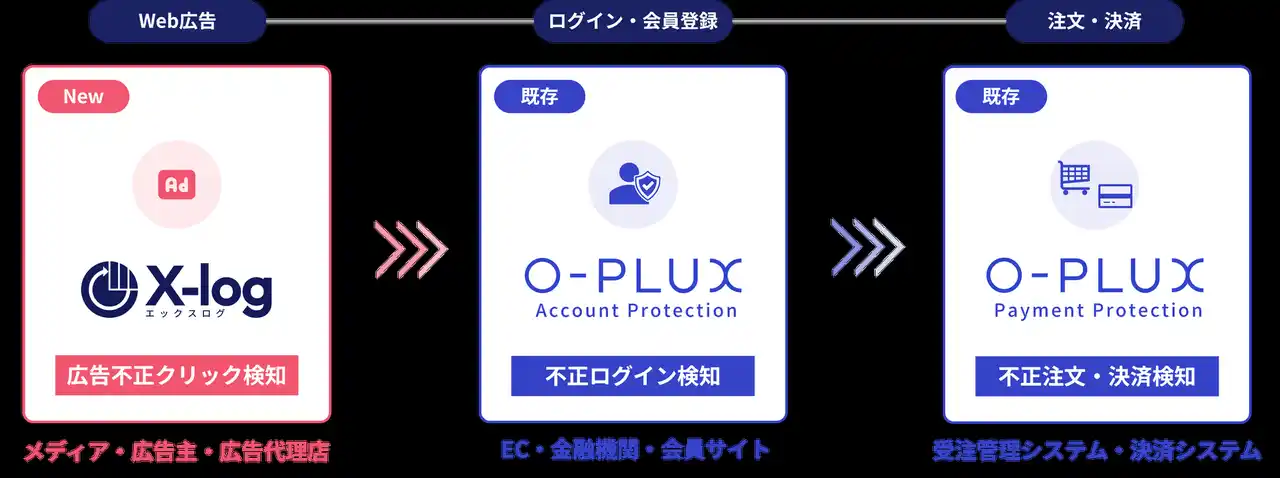 本サービスにより、広告流入段階での不正クリック(アドフラウド)による広告費の無駄を検知・削減することが可能となり、当社がこれまで提供してきた「O-PLUX(オープラックス)」と合わせ、広告集客からログイン、決済に至るまで、オンラインビジネスにおける不正対策をシームレスに提供できる体制が整いました。 |