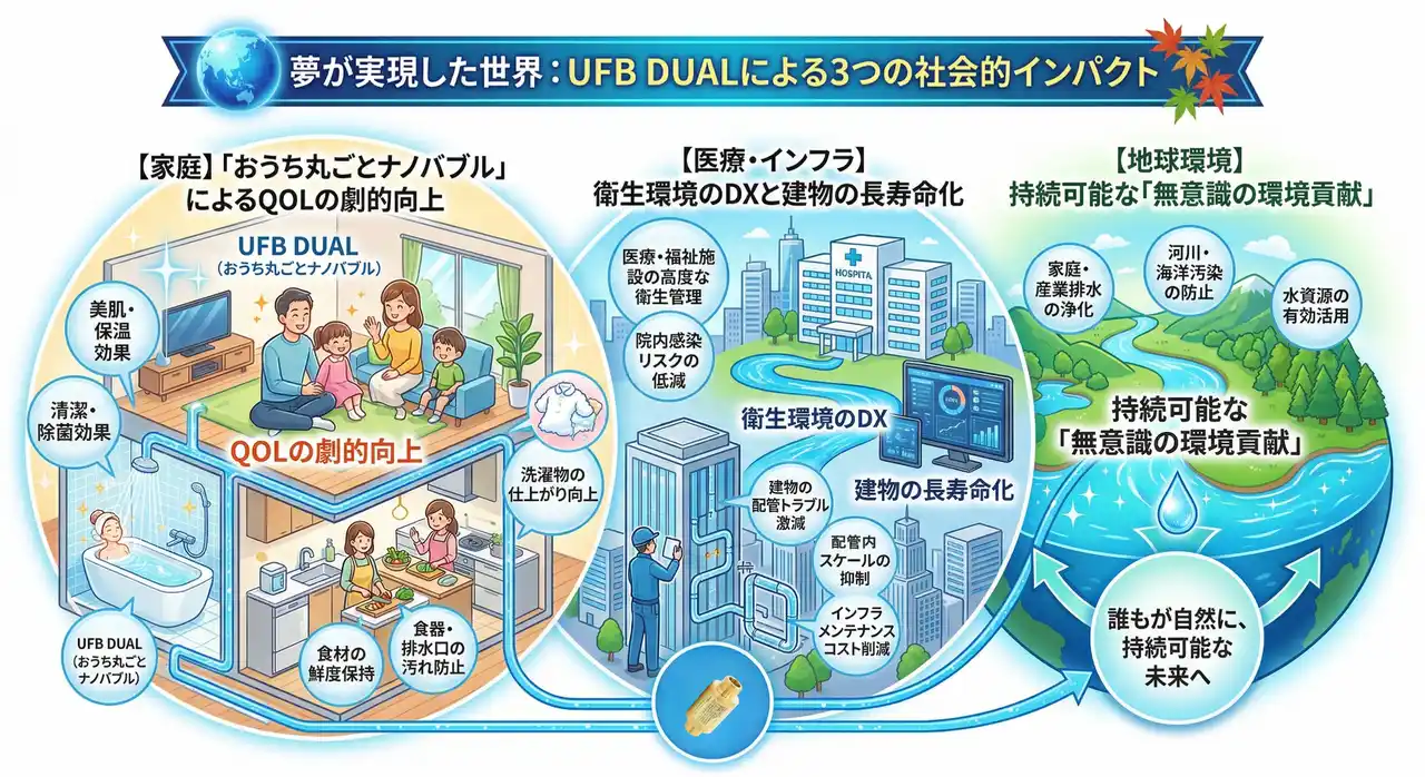 【家庭】「おうち丸ごとナノバブル」によるQOLの劇的向上: 家中すべての水をナノバブル化。浴室では、水道水に比べ保湿持続時間が高まります。肌トラブルを防ぎ、洗剤を最小限に抑え、家事の負担を「無意識に」軽減する豊かな暮らしが定着します。 |