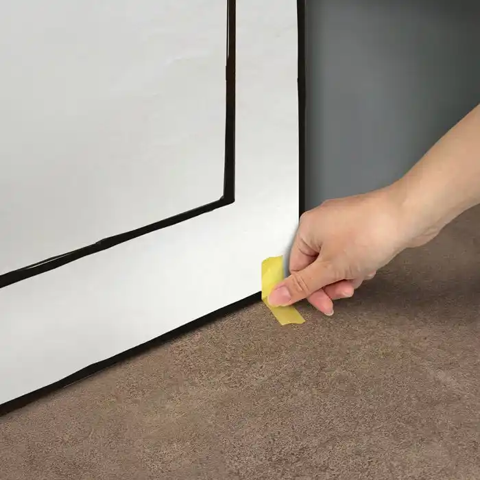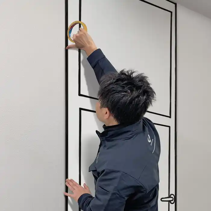 特殊ポリマー粘着層を備えた透明被膜を、ドア枠に 圧着するだけで取付が完了する超低コスト施工。 |