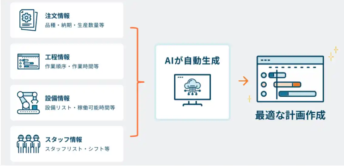 | 効率的にオーダーをこなす生産計画を、独自開発AIが立案。生産効率改善を支援することで業績改善をサポートします。 | |||