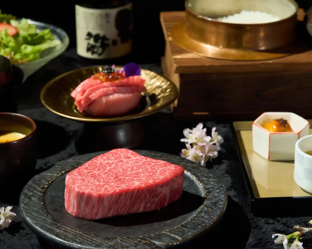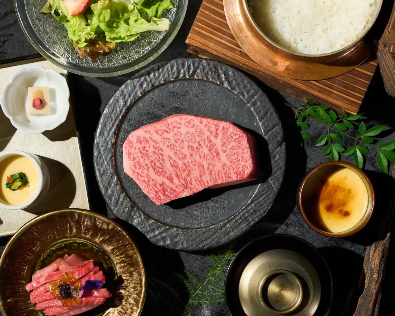 ・日本酒 獺祭スパークリング ・季節の前菜三種 ・本鮪和牛のユッケ ・季節のフルーツサラダ ・リブロースステーキ 200g ・八代目儀兵衛のお米使用 銀シャリ ・テールスープ ・ほうじ茶アイス |
