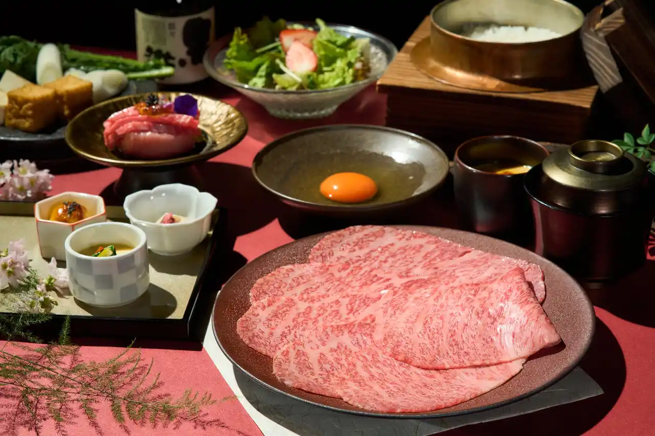 ・季節の前菜三種 ・本鮪和牛ユッケ ・季節のフルーツサラダ ・鹿児島黒牛 すき焼き ・春菊/焼き豆腐/国産長ネギ/しらたき ・八代目儀兵衛のお米使用 銀シャリ ・牛テールスープ ・ほうじ茶アイス |