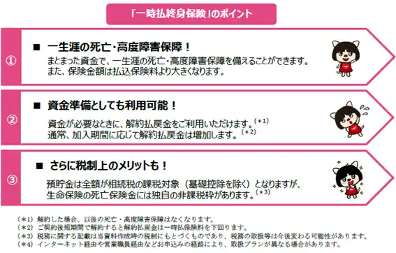 | 今回、マイナス金利政策等の影響により2016年7月から販売停止としていた、『一時払終身保険』の販売を再開します。当保険は、万一の場合の遺族保障だけでなく、貯蓄性を備えており、保障と貯蓄双方のニーズにお応えすることができます。また、相続税対策として死亡保険金の非課税枠を活用することが可能な税制メリットも有する商品です。 | |||